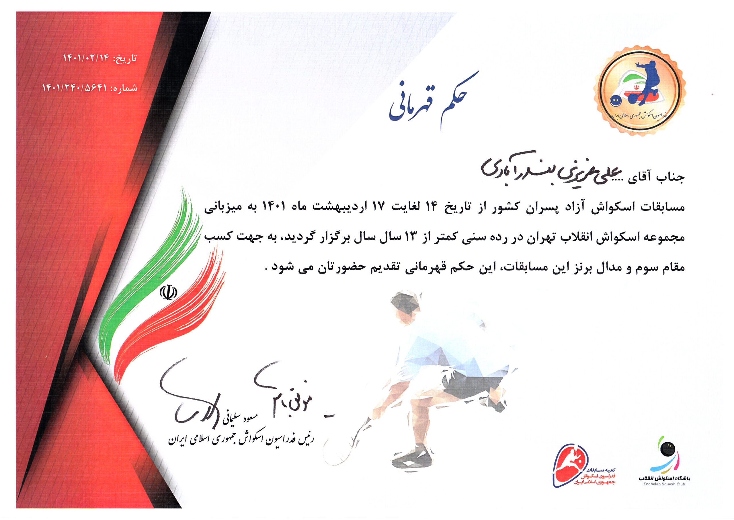 مسابقات اسکواش در ردههای سنی کمتر از ۱۳، ۱۵، ۱۷، ۱۹ سال پسران قهرمانی کشور به میزبانی باشگاه انقلاب تهران برگزار و نفرات برتر معرفی شدند.