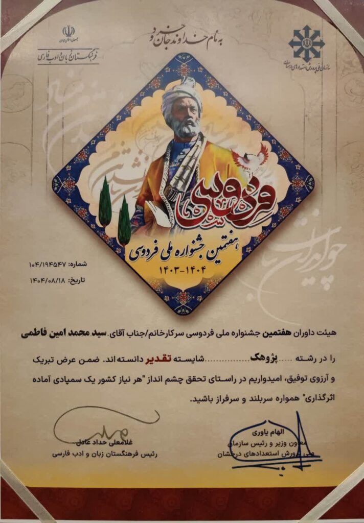 تنها برگزیده کشوری سمپاد استان یزد در هفتمین جشنواره ملی فردوسی از دبیرستان شهیدان مزیدی